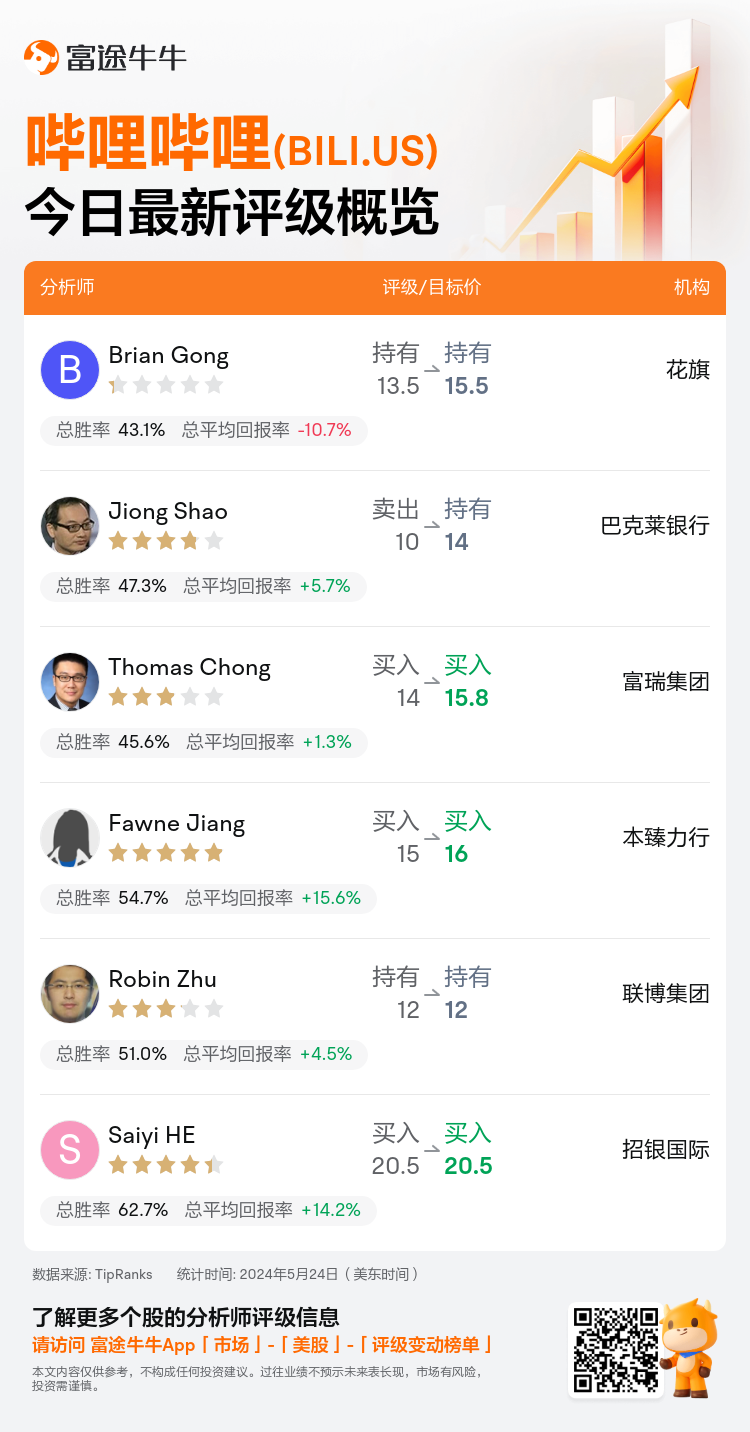 以下为当天6位分析师对$哔哩哔哩 (BILI.US)$的最新投资评级及见地价: