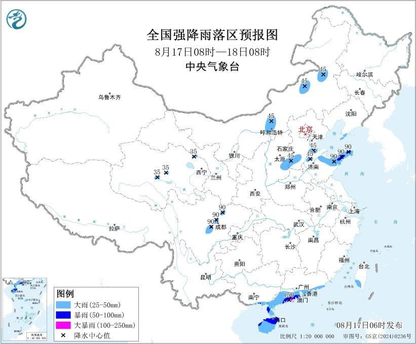 展望,8月17日08时至18日08时,内蒙古中东部、山西东南部、河北南部、山东中北部、青海中北部、四川盆地西部、广西东南部沿海、广东南部沿海、海南岛、台湾岛南部等地部分地区有大到暴雨,其中,广东西南部沿海等地局地有大暴雨(100~150毫米)。上述部分地区伴有短时强降水(最大小时降雨量20~50毫米,局地可特出70毫米),局地有雷暴大风等强对流天气。