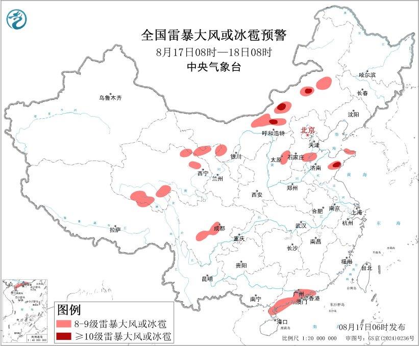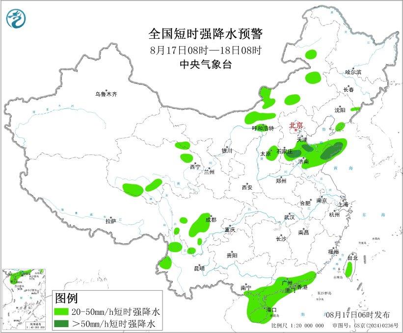 展望8月17日08时至18日08时,内蒙古中东部、西北地区中部、华北中南部、黄淮北部、西南地区北部、华南南部等地的部分地区将有8级以上雷暴大风或冰雹天气,其中,内蒙古中部、山东中东部等地的部分地区将有10级以上雷暴大风;内蒙古中部和东部、西北地区中部、华北中南部、黄淮北部、西南地区北部、华南南部等地的部分地区将有小时雨量大于20毫米的短时强降水天气,其中,河北南部、山东北部和东部等地的部分地区小时雨量大于50毫米,最大可达70毫米以上。