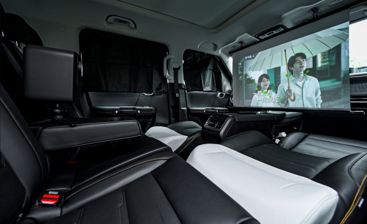 前排座椅可向后打平,带来平整的不雅影空间。提供投影幕布挂钩,旁边投影仪终结车内影院遵守。后备箱220V 150w的插座,取电也很便利。