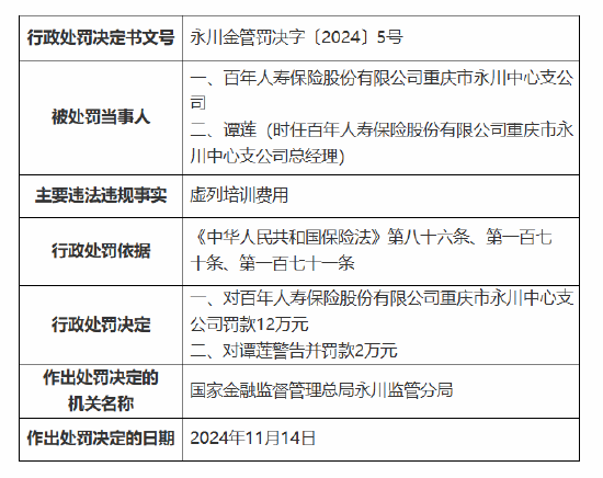 11月21日金融一线音问,国度金融监督科罚总局永川监管分局行政处罚信息公开表露出,百年东说念主寿保障股份有限公司重庆市永川中心支公司因虚列培训用度,被国度金融监督科罚总局永川监管分局罚金12万元;谭莲(时任百年东说念主寿保障股份有限公司重庆市永川中心支公司总司理)被警戒并罚金2万元。