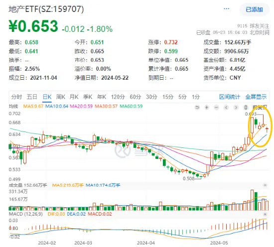 周四(5月23日),商场全天低开低走,三大指数均跌超1.3%,超4500只个股下落。地产板块陪同大市鼎新世博体育,龙头房企大皆收跌,代表A股龙头地产行情的地产ETF(159707)全天水下震撼,午后有所拉升回暖,场内价钱收跌1.8%,日线收出“十字星”,标明多空力量胶著。交投保管活跃,全天换手率超22%,成交额接近1亿元。